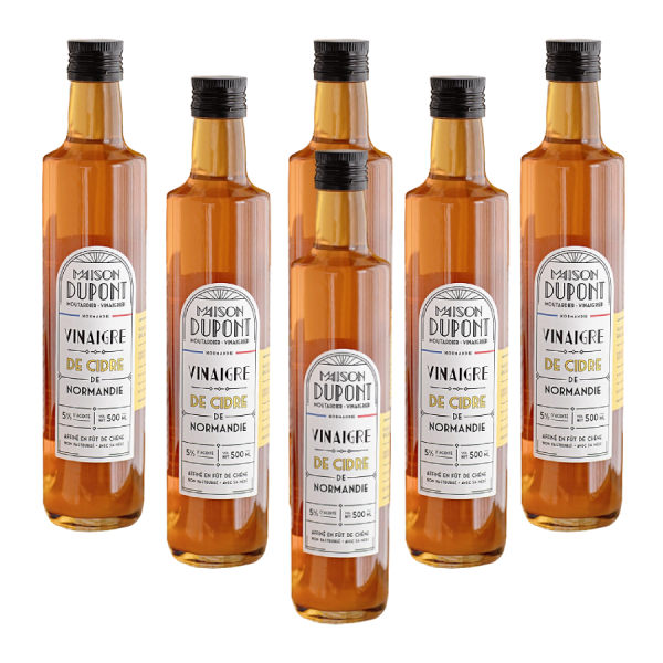 Ce lot de six bouteilles en verre renferme un vinaigre de cidre de grande qualité, méticuleusement élaboré par la Maison Dupont à partir de pommes Normandes. Le vinaigre conserve son caractère naturel, étant non pasteurisé, exempt de sulfites ajoutés et subtilement filtré. Chaque bouteille contient la mère de vinaigre, contribuant à sa valeur distinctive. Cet accompagnement culinaire s'avère idéal pour rehausser vos salades et plats, tout en pouvant être intégré dans une démarche de cure détoxifiante.