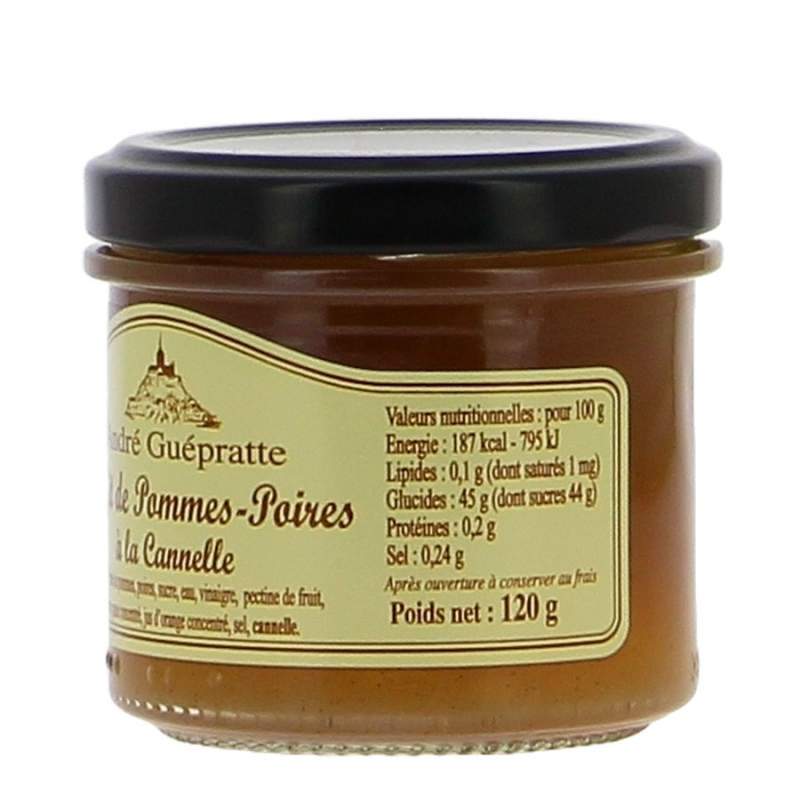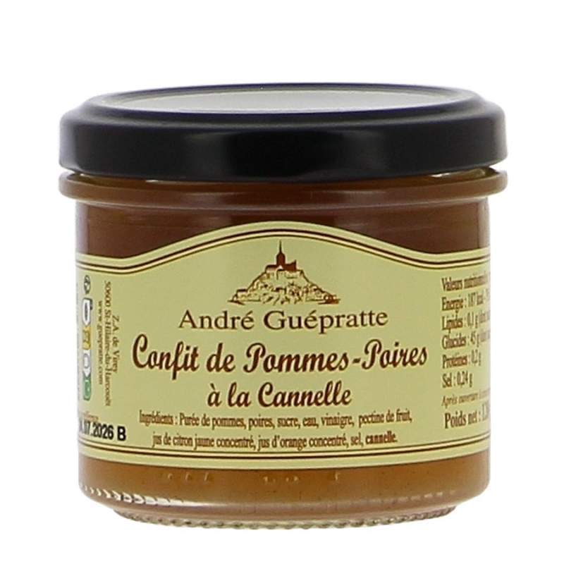 Le confit de pommes poires à la cannelle d'André Guépratte est préparé avec du vinaigre de vin, de la purée de pommes et de réels morceaux de poires broyées.