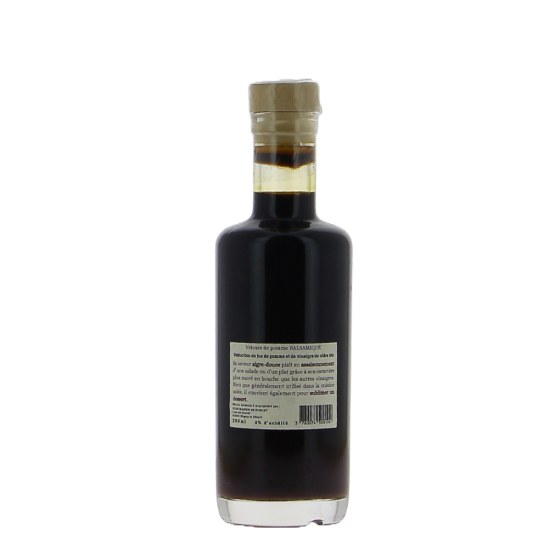 Issu du savoir-faire artisanal normand, le vinaigre de pomme balsamique du Manoir de Durcet est une création d’exception. Élaboré dans l’Orne, il associe la douceur naturelle de la pomme à une légère acidité, offrant un équilibre parfait entre gourmandise et finesse. Sa texture de velours rappelle celle des meilleurs vinaigres balsamiques, idéale pour rehausser vos plats avec élégance.