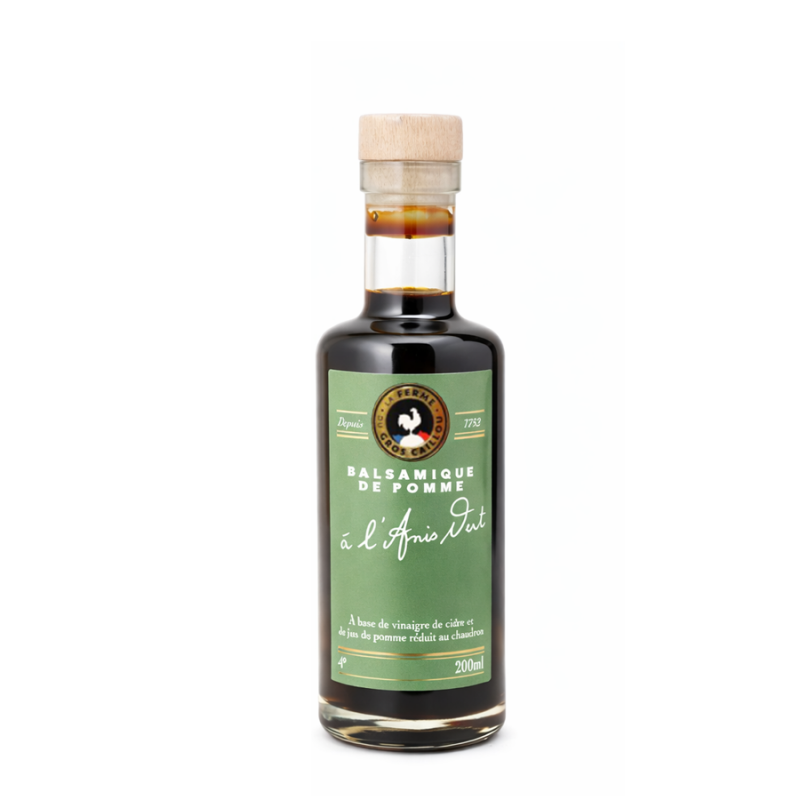 Le balsamique de pomme est obtenu par réduction lente d’un mélange exclusif de vinaigre de cidre et de jus de pomme issu des vergers familiaux. Cette version à l’anis vert dévoile un profil aromatique délicat, entre fraîcheur herbacée et légère note réglissée.